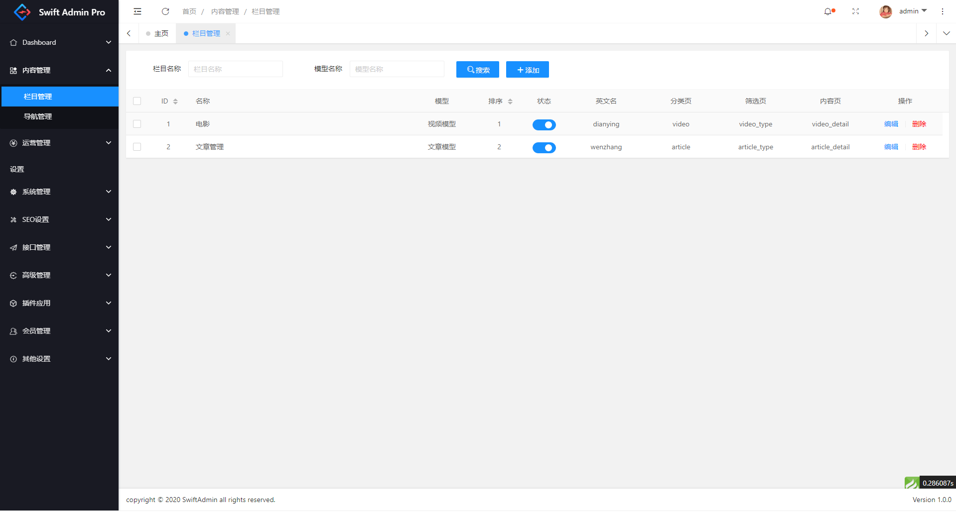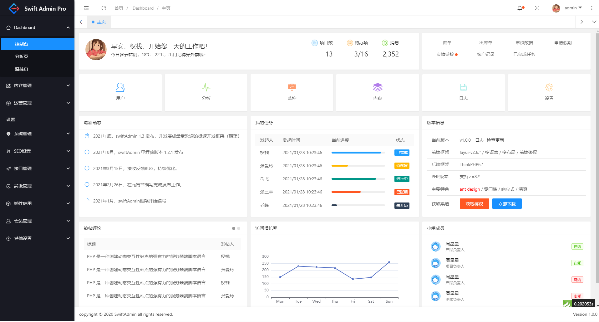 SwiftAdmin框架主张简单就是高效的原则,在设计和运维上采用最精简最高效的做法去完成业务系统的需求,并且基于ant Design的设计原则,是一款优秀的前后台极速开发解决方案。相信你第一眼就有立刻想体验SwiftAdmin框架的冲动和热情!